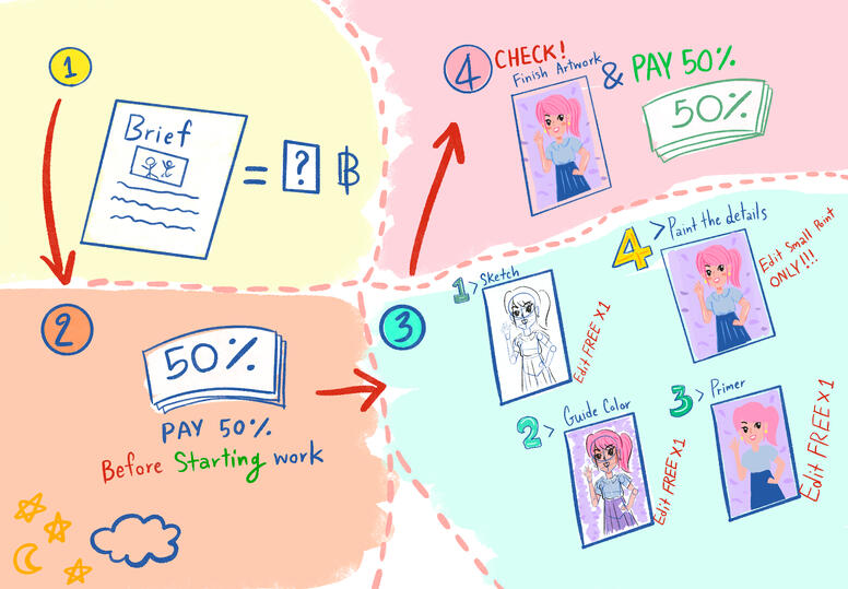 (2) หลังจากรับบรีฟมาและตกลงราคาเสร็จเรียบร้อยแล้ว รบกวนจ่ายค่ามัดจำงาน 50% ก่อนเริ่มงาน | (2) After the artist recieves the brief and confirmation price. You will have to pay a deposit 50% before strarting work. |